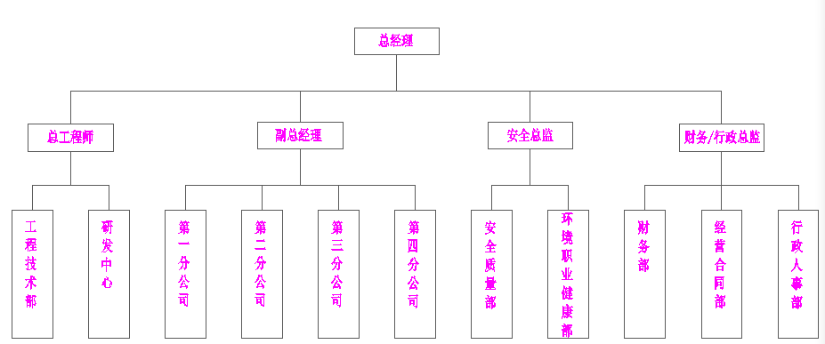 實行總經(jīng)理負(fù)責(zé)制,下設(shè)總工程師、副總經(jīng)理、安全總監(jiān)、財務(wù)/行政總監(jiān)四個機(jī)構(gòu),各機(jī)構(gòu)分管工作如下: